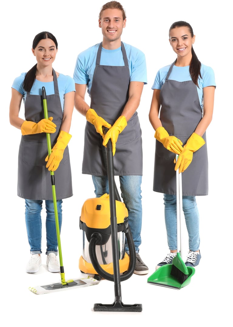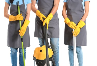 A group of people is working in a park-like setting, engaged in gardening activities. The scene features well-maintained hedges and trees, with some workers dressed in blue uniforms. In the background, there are several buildings with classic architecture under a partly cloudy sky.